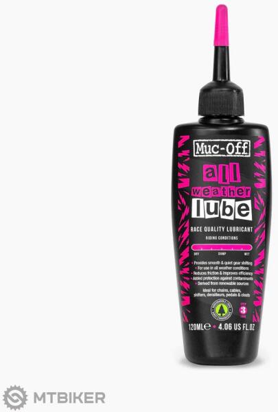 A Muc-Off All-Weather Chain Lubricant egy nagy teljesítményű szintetikus kenőanyag. Az egyedülálló, vízlepergető összetétel mélyen behatol a láncszemekbe, és tartós védőbevonatot hoz létre, amely véd a korróziótól és a kopástól. Az adalékanyagok egyedülálló keveréke az extrém terhelésekhez biztosítja, hogy a kenőanyag még a legigényesebb hajtásokat is kibírja . A Muc-Off kenőanyag összetétele kenést biztosít hosszú távon, közúton, terepen és minden időjárási körülmények között.